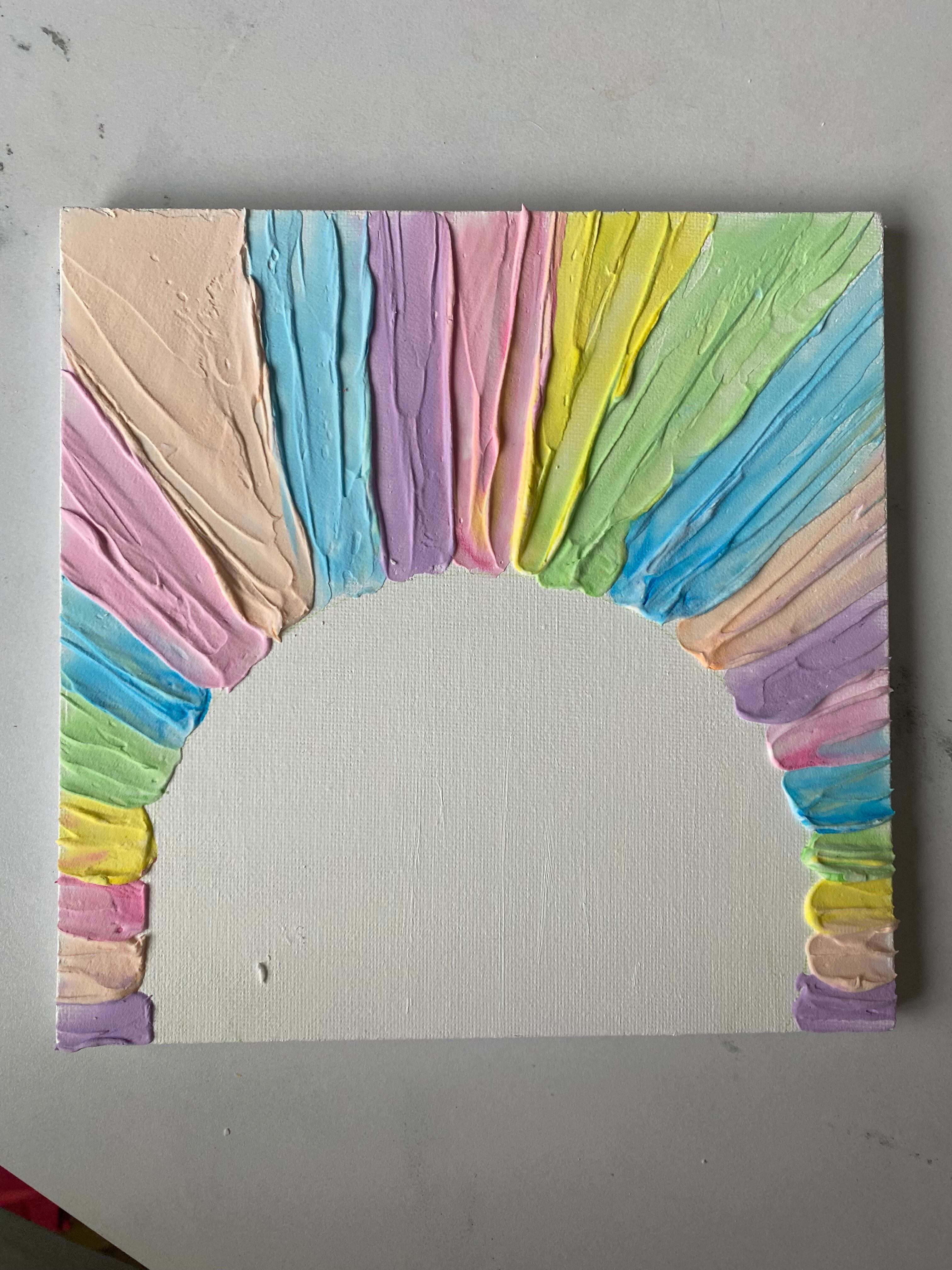 テクスチャアートを堪能してもらうため、虹のラインはほんのり曲線で隣の色と重ねたり工夫を凝らしています。正面だけではなく、横から見るなどお子様と会話が弾むような仕掛けになっています。